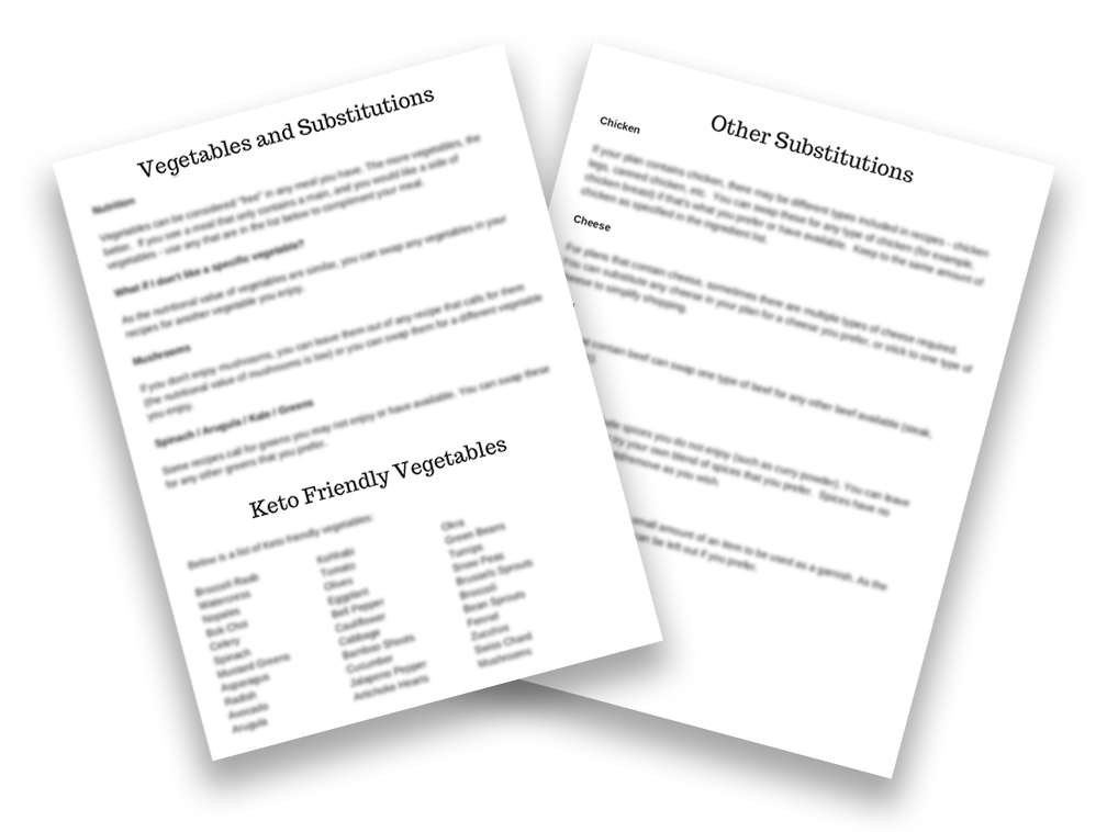 We customize the meals in your plan so that they only use foods you like. But just in case, every custom Keto meal plan also includes two full pages showing you how to substitute ingredients if needed.